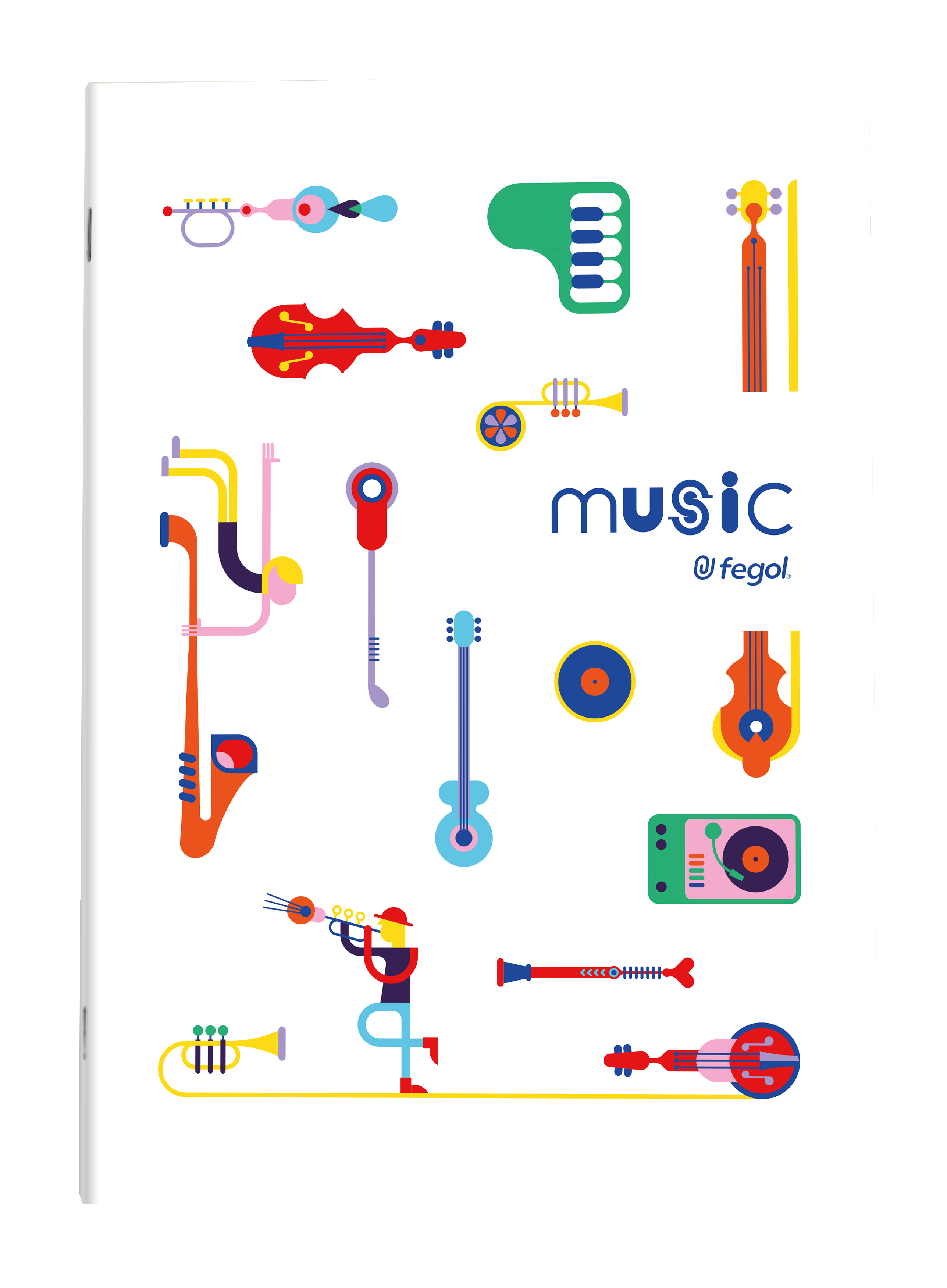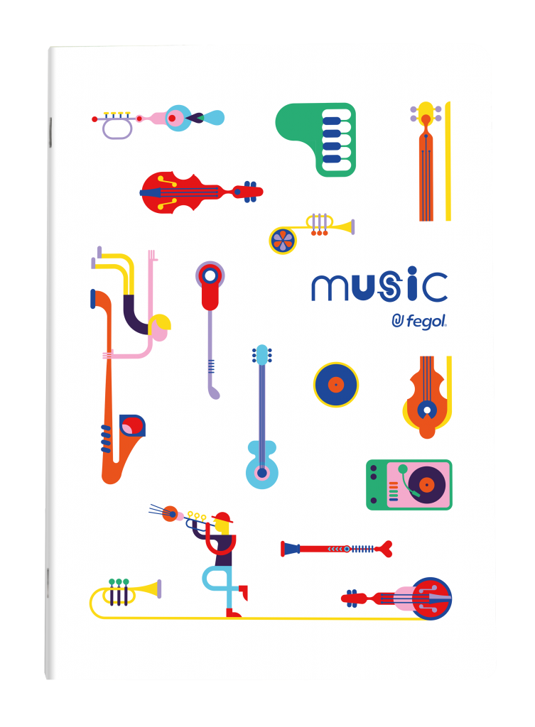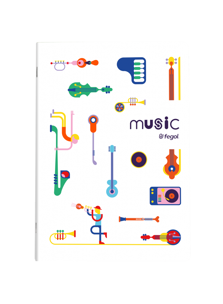 Cahier agrafé avec couverture en cartón imprimé, spécialement conçu pour être utilisé dans les classes de musique. Feuilles avec la partition musicale imprimée et lignes pour écrire notes de musique.