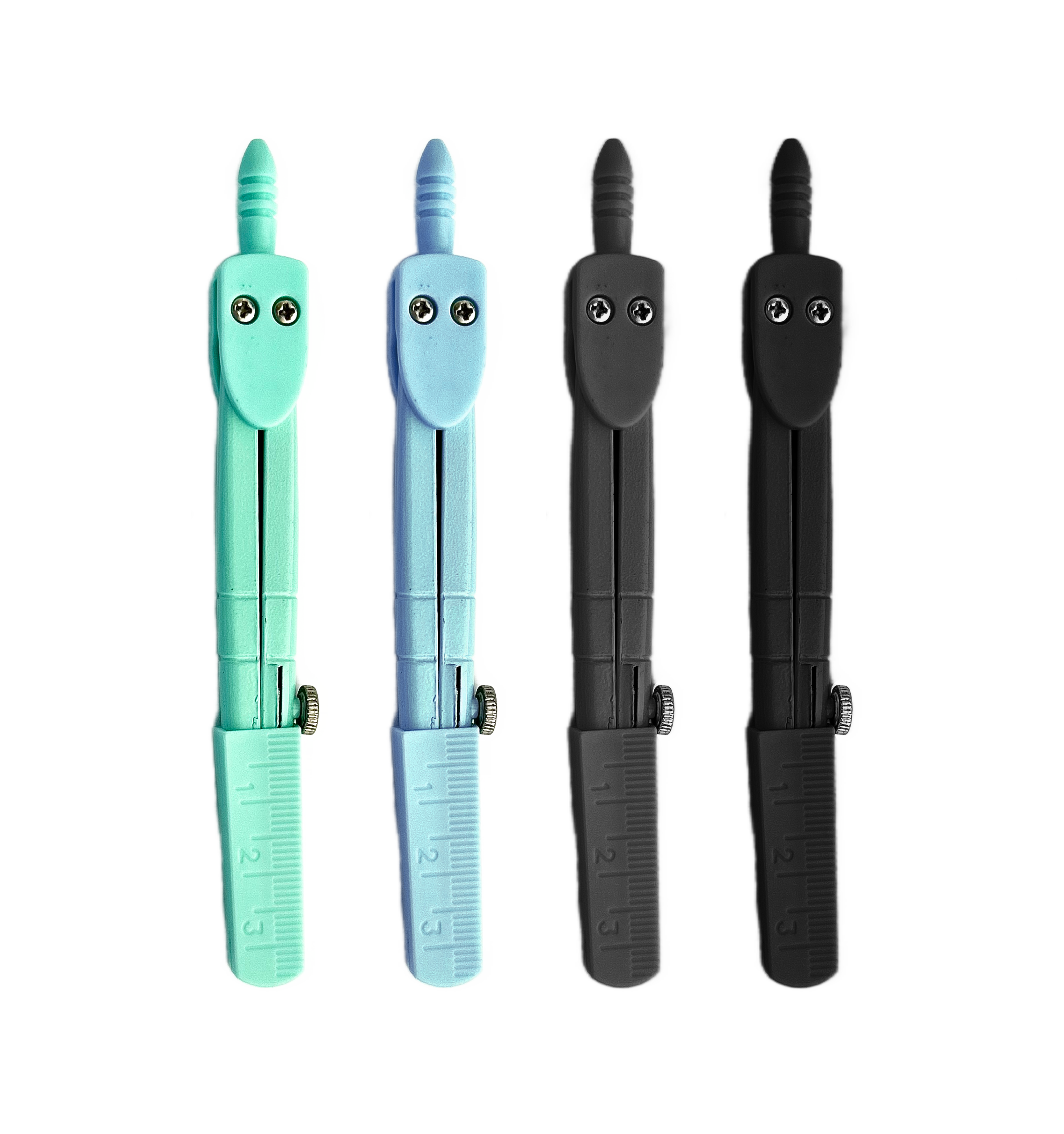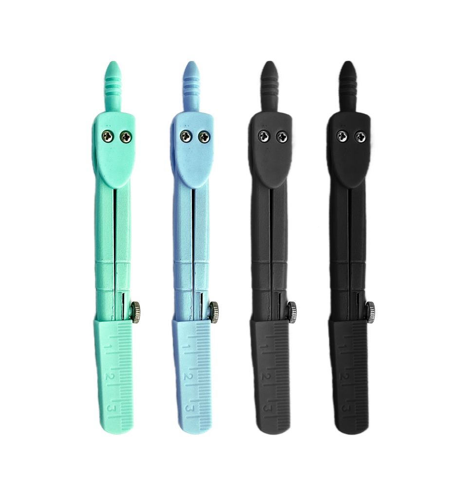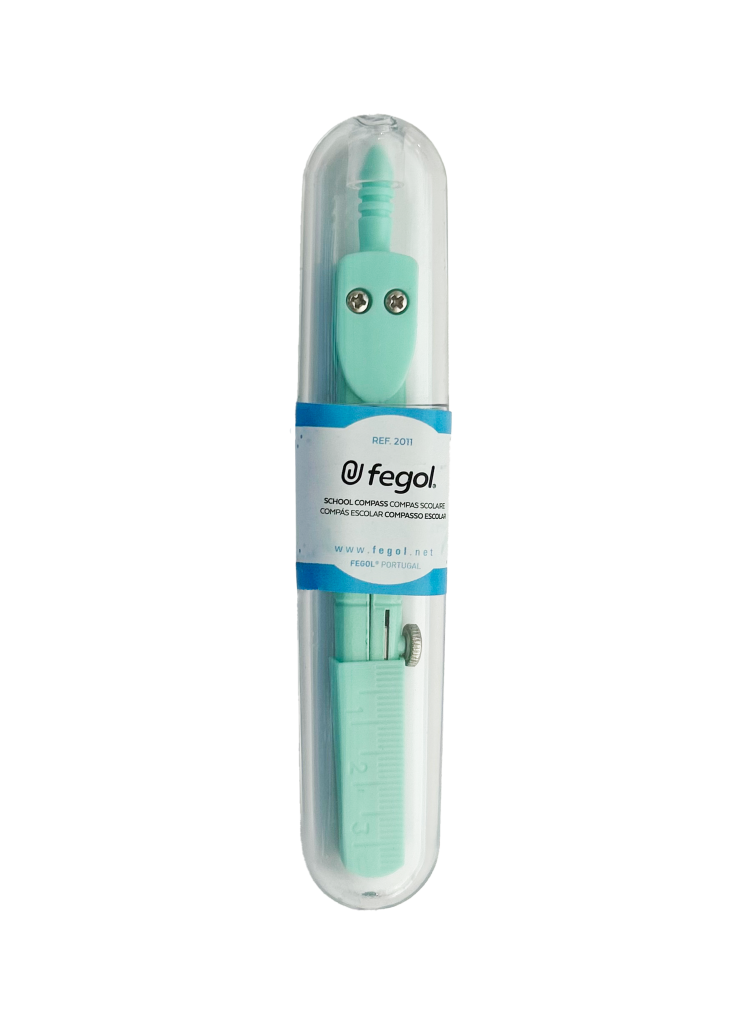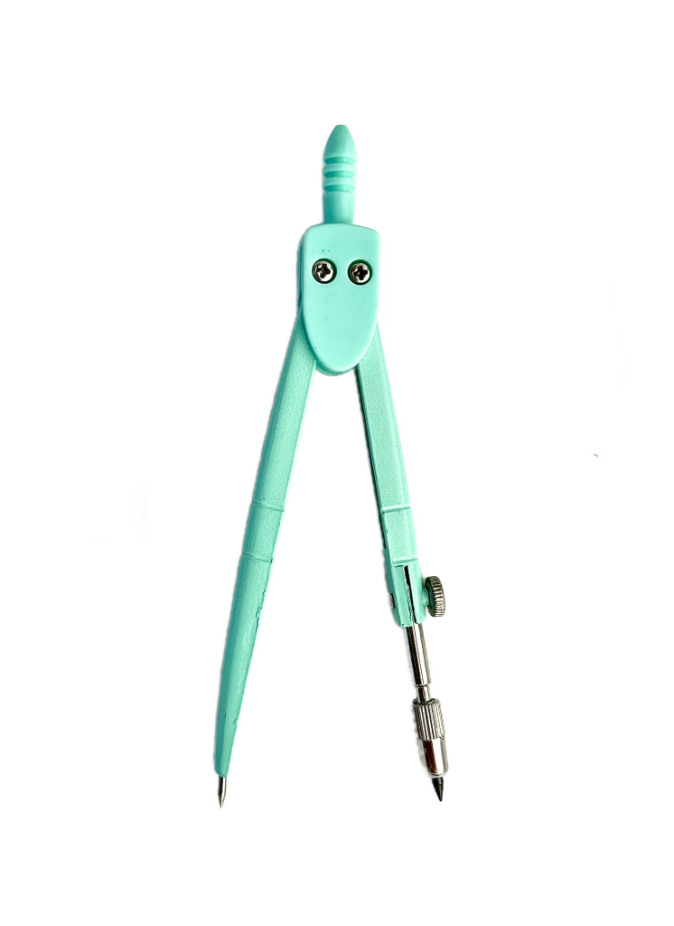 Compas à piéces interchangeables en métal nickelé, branche à articulation. Creux de prehension confortable. Bôite en plastique trés resistant.