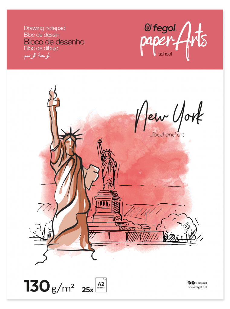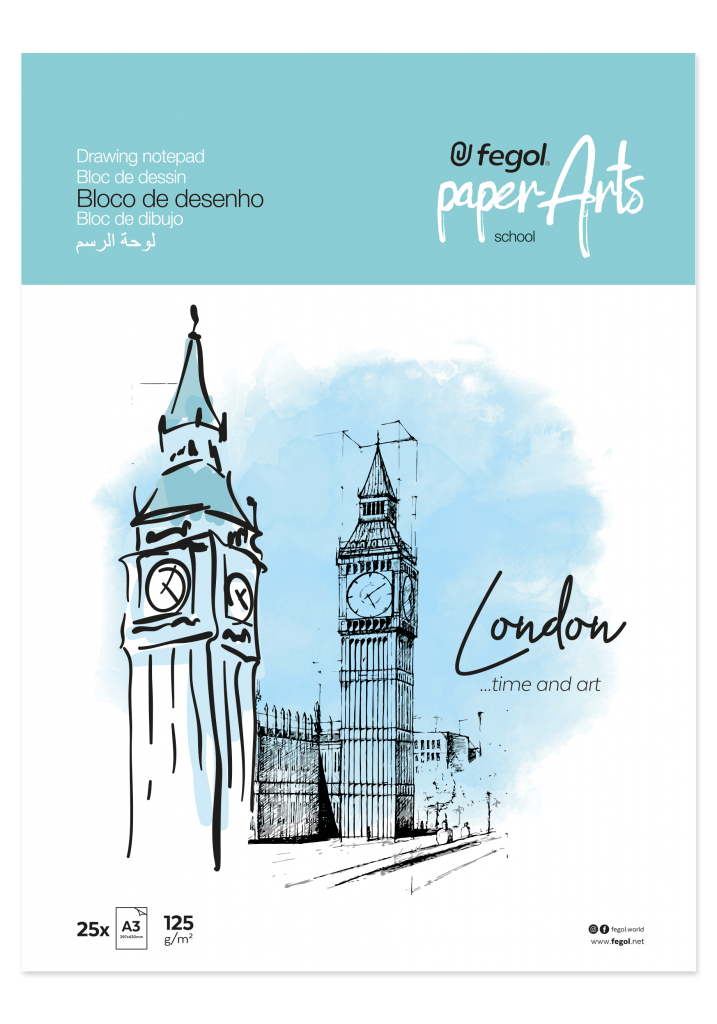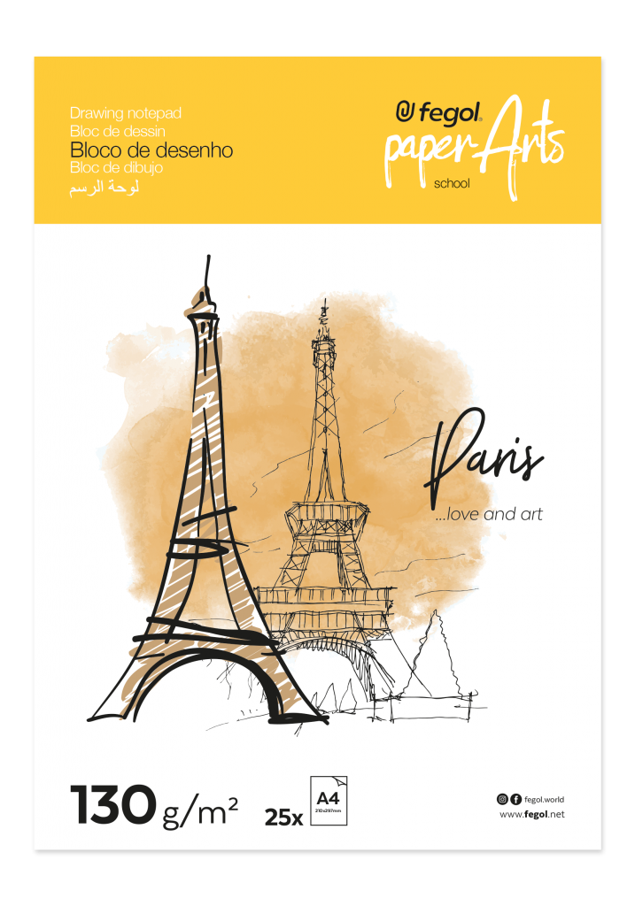Bloco escolar de papel desenho branco com 130g/m2, sem margens, colado no topo. Capa impressa com plasticização mate. Ideal para desenhos a lápis, pastel, marcadores e giz artístico.